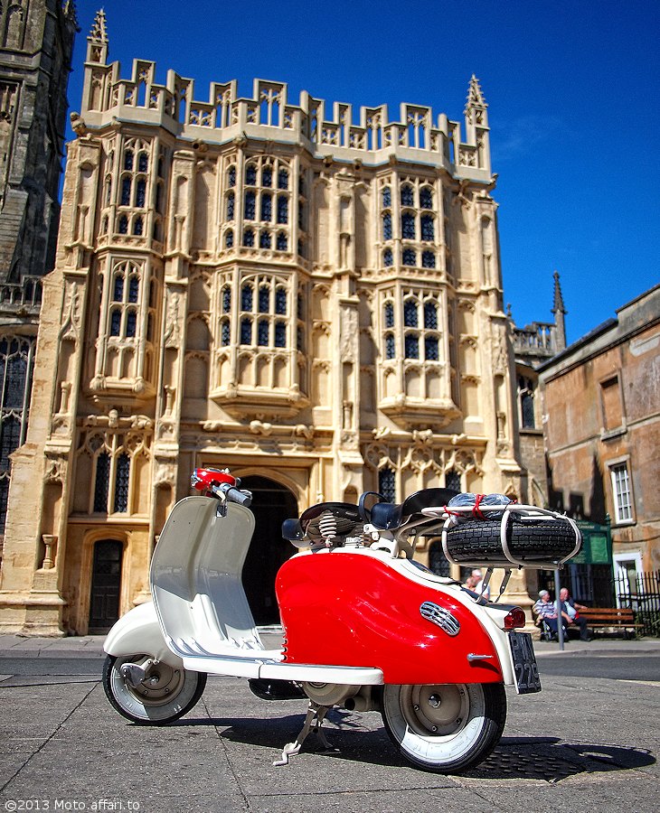 La serieta' della facciata della chiesa e la colorata eleganza dello scooter non sono incompatibili, e la Lambretta potrebbe non essere di un visitatore di passaggio. Immaginate il parroco di Cirencester, col clergyman, che va in giro per le colline dei Cotswolds con la sua Lambretta e incrocia una comitiva di mod con le loro Vespe coperte di fanali e specchietti: i mod salutano, il prete saluta, un paio di vecchiette impegnate a stendere il bucato osservano e scuotono la testa.