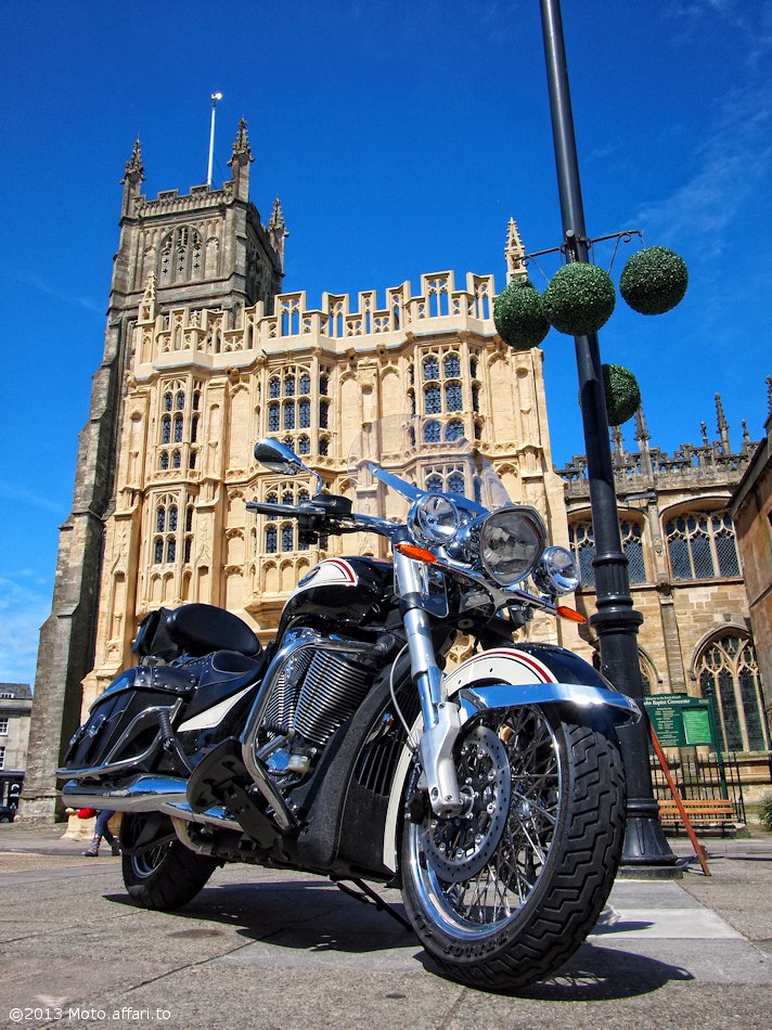14/07/2013 | Claudio_VL | 0 commentiHo un sito che si occupa del viaggiare leggeri, ma riconosco che non sempre si vuol viaggiare leggeri, altrimenti tutti i motociclisti girerebbero su moto da trial, o su stradali stile cafe racer alleggerite di tutto il possibile. No, a volte desideriamo viaggiare comodi, magari con stile un po' americano, come se tutte le strade di fronte a noi fossero rettilinei, dimenticandoci che l'autostrada italiana media ha piu' curve di una statale americana. Qualche mese fa ero a Cirencester, nei colli inglesi chiamati Cotswolds (colline ... questa parola ha lo stesso significato, a qualunque Stato la si applichi: paradiso per motociclisti), e ho visto non solo la moto piu' bella di tutti i tempi e una Lambretta. Visto che c'e' una grande chiesa gotica, qualcuno ha pensato bene di arrivare con una moto piu' imponente di una cattedrale, e di parcheggiarla nella piazza davanti alla chiesa gotica dedicata a San Giovanni Battista, forse per far ammirare l'architettura del bicilindrico a V (sara' in stile gotico?).